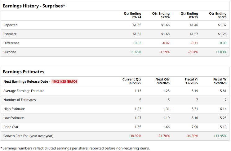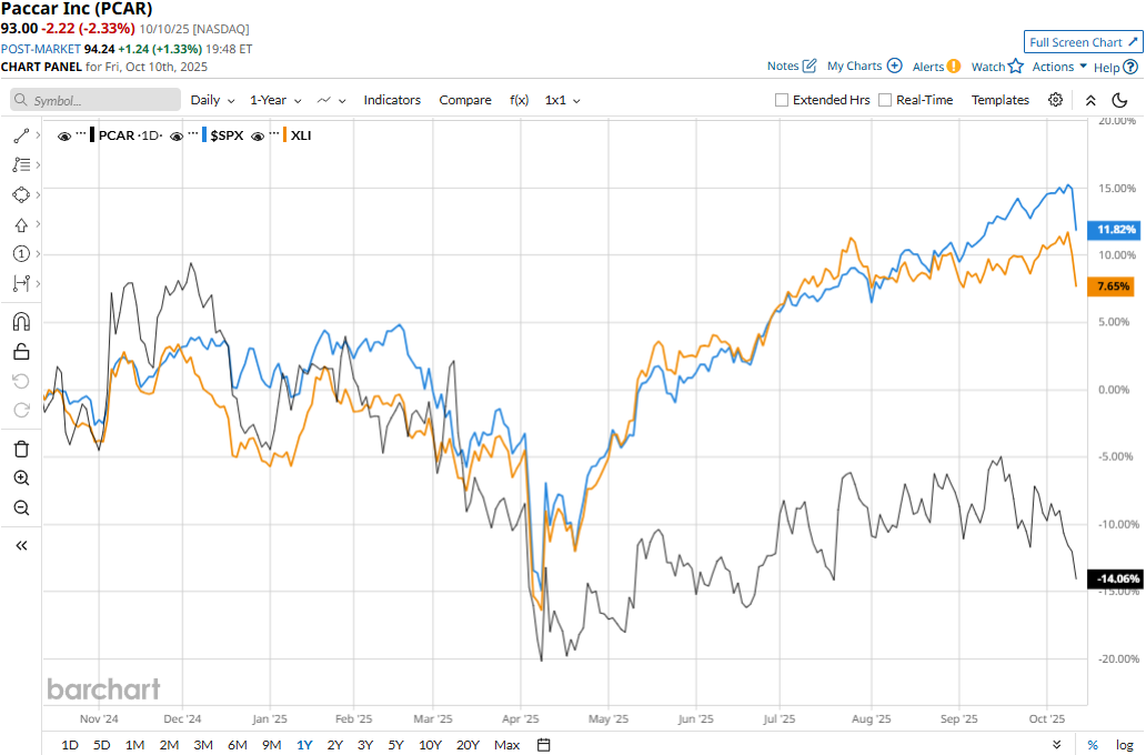 PACCAR's Quarterly Earnings Preview: What You Need to Know![]() Bellevue, Washington-based PACCAR Inc. (PCAR) designs, manufactures, and distributes light, medium, and heavy-duty commercial trucks for the over-the-road and off-highway hauling of commercial and consumer goods. With a market cap of $48.8 billion, PACCAR operates through Truck, Parts, and Financial Services segments. The industrial sector giant is set to announce its Q3 results before the market opens on Tuesday, Oct. 21. Ahead of the event, analysts expect PACCAR to report a profit of $1.13 per share, down 38.9% from $1.85 per share reported in the year-ago quarter. The company has surpassed Wall Street’s bottom-line projections twice over the past four quarters while missing on two other occasions. For the full fiscal 2025, PCAR is expected to deliver an EPS of $5.19, down a massive 34.3% from $7.90 in 2024. While in fiscal 2026, its earnings are expected to grow nearly 12% year-over-year to $5.81 per share. ![]() PCAR stock prices have plunged 10.3% over the past 52 weeks, notably underperforming the Industrial Select Sector SPDR Fund’s (XLI) 10.2% gains and the S&P 500 Index’s ($SPX) 13.4% returns during the same time frame. ![]() PACCAR’s stock prices surged 6.1% and maintained a positive momentum for the next three trading sessions following the release of its better-than-expected Q2 results on Jul. 22. Although its financials remained under pressure during the quarter, they came ahead of Street expectations. PACCAR reported a notable 15.7% year-over-year decline in net sales to approximately $7 billion, but surpassed the Street's expectations by 2.5%. Meanwhile, its net income plunged by 35.5% to $723.8 million, but its EPS of $1.37 surpassed the consensus estimates by 7%. Analysts remain cautiously optimistic about the stock’s prospects. PCAR has a consensus “Moderate Buy” rating overall. Of the 18 analysts covering the stock, opinions include six “Strong Buys,” 11 “Holds,” and one “Strong Sell.” Its mean price target of $103.73 suggests an 11.5% upside potential from current price levels. On the date of publication, Aditya Sarawgi did not have (either directly or indirectly) positions in any of the securities mentioned in this article. All information and data in this article is solely for informational purposes. For more information please view the Barchart Disclosure Policy here. |